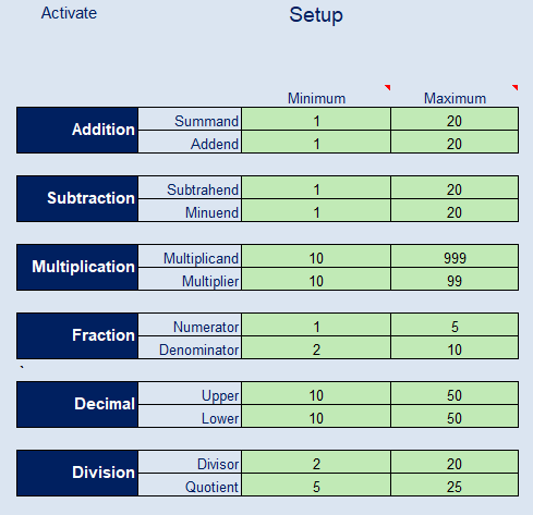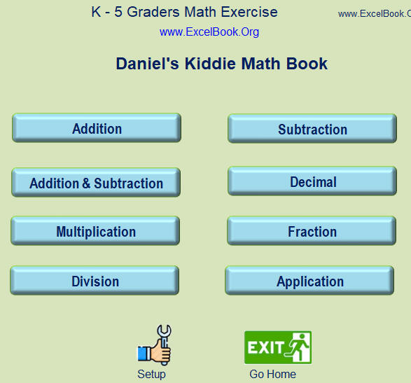 Excel Math Exercise Book ( Download Free Trial version here) This is for K-5 elementary students to practice on their math. It is NOT an online program NOR a program for your children to work on a computer in front of a computer. It is a Math Exercise Book that you can print out unlimited versions of mathematic exercises for your children to practice after school to improve their math skills. Great features of this Excel math program: 1. For K - 5 graders practice on: addition, subtraction, multiplication, division, decimal, faction, and applications. * This math exercise book can print out as many pages as you want. Please click here to see the Demo this YouTube